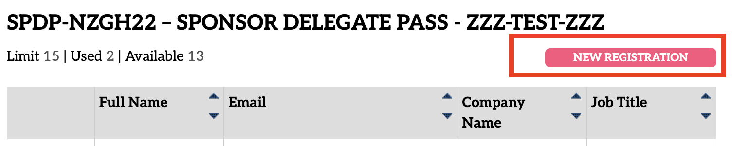 To register yourself or your team for a Sponsor Delegate pass, click on the "New Registration" button from the Pass Summary grid on the page and follow page instructions. Each registrant must have a unique email address for registration purposes.