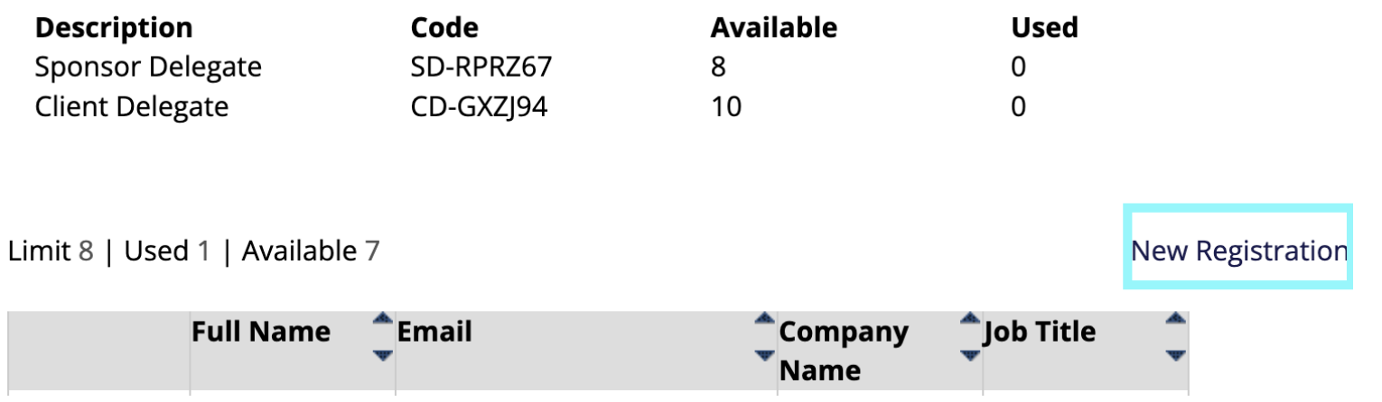 To register yourself or your team for a Sponsor Delegate pass, click on the "New Registration" button from the Pass Summary grid on the page and follow page instructions. Each registrant must have a unique email address for registration purposes.